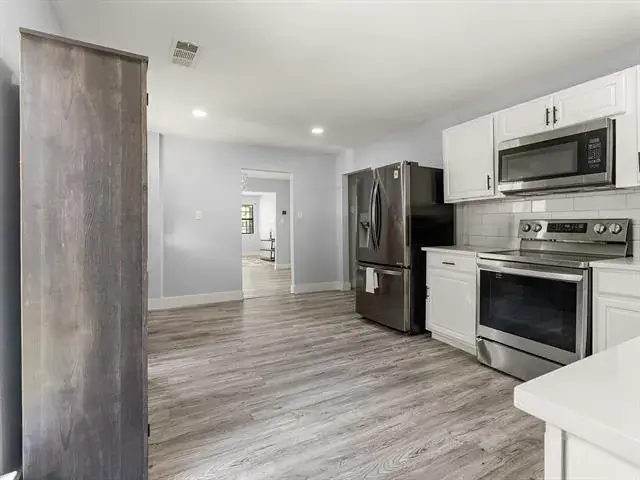 The updated kitchen showcases granite countertops, white cabinetry, brand new appliances, and stylish finishes that blend functionality with contemporary charm. Fresh interior and exterior paint, along with durable laminate flooring throughout, create a clean and cohesive aesthetic.