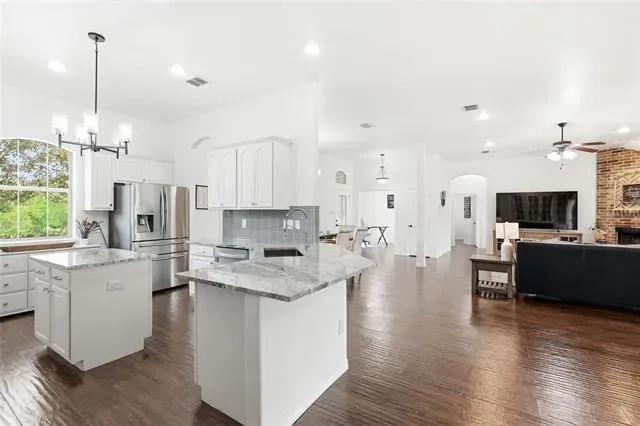 Escape the city without sacrificing convenience! This fully remodeled 4-bedroom, 2-bathroom home sits on 2 beautiful acres, offering the perfect blend of wide-open space and modern updates. Inside, durable wood-look tile floors run throughout the entire home for easy maintenance and a seamless look. The heart of the home is the spacious open living area, where a wood-burning fireplace and a massive wall of windows frame peaceful views of the mature trees in back and bring in tons of natural light. The kitchen is ready for the home cook, featuring sleek granite countertops, crisp white cabinets, a walk-in pantry, and stainless steel appliances.