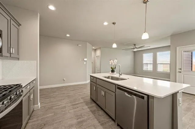 Beautifully designed and lightly lived-in. 11308 Guinness is located in North Fort Worth-Haslet and is ready for new owners! Inside, modern finishes meet everyday convenience with an open-concept layout that’s both stylish and functional. This single-story home is beautifully maintained, feels almost new, and features a spacious, light, and bright living area flowing seamlessly into the dining and kitchen, perfect for entertaining or quiet nights in. The kitchen is a true centerpiece where everyone will love gathering – quartz countertops, an oversized island, gas range, built-in microwave, a dishwasher, refrigerator, plenty of cabinets, plus a generous walk-in pantry. Natural light fills the adjacent breakfast area, creating an inviting place for meals. The large primary suite offers a peaceful retreat, with views to the backyard, and its ensuite bath, walk-in closet, double sinks, standalone shower, and extra linen storage. Three additional bedrooms are thoughtfully separated from the primary bedroom, and comfortably sized, with a pretty guest bath situated perfectly in between. Everyday living is made simple with a large laundry room, tankless water heater, and included washer and dryer. A sprinkler system keeps the lawn green, and the two-car garage provides plenty of parking and storage. Outside, you’ll enjoy the large covered back patio, just right for relaxing or enjoying your morning coffee, a huge backyard, plus a large storage shed offering extra space for tools and gear. A cute neighborhood park is right around the corner, only steps away, with plenty of space to explore, hold large gatherings, and have lots of outdoor fun! This home is move-in ready and equipped with all the perks, making it a great choice for choosy buyers seeking comfort, style, and the perfect place to call home. Ideally located with quick access to 287 and major highways, and just minutes from Alliance for shopping, dining, and entertainment. Make your move today!
