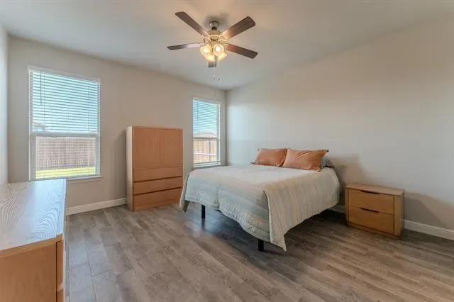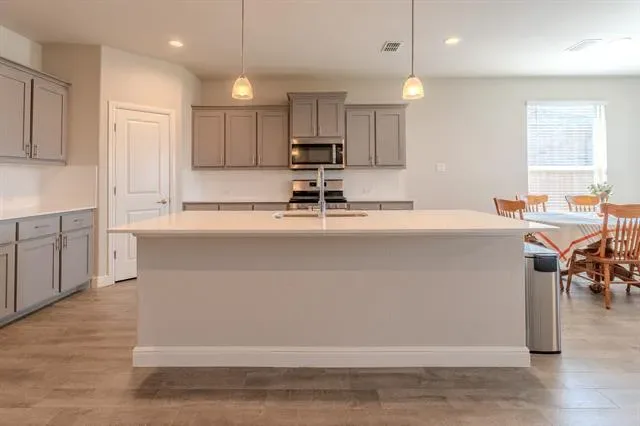 Welcome to this beautifully maintained, move-in-ready single-story home in the highly sought-after Northwest ISD. Featuring four bedrooms and two baths, this residence offers a thoughtful layout, stylish finishes, and numerous upgrades designed for both comfort and entertaining. A newly installed Class 3 impact-resistant roof (rated for 110–130 mph winds) provides added durability and peace of mind, complete with a transferable warranty. Additional exterior highlights include a striking stone and brick elevation, custom landscaping, a storm glass front door, and a retractable back patio screen. Inside, the chef’s kitchen is a standout, featuring quartz countertops, a tiled backsplash, stainless steel appliances including a gas range, upgraded hardware, and elegant cabinet lighting. The oversized island offers generous prep space, while the coffee bar and walk-in pantry add both convenience and charm. The open-concept design flows seamlessly into the dining and living areas, complemented by a tucked-away office nook. The spacious primary suite features dual quartz vanities, an oversized walk-in shower with built-in seating, a linen closet, and a large walk-in closet. Secondary bedrooms are well-sized, with one offering custom Elfa shelving—perfect for storage or creative use. Additional features include a functional drop zone off the garage, a large laundry room, Z-Wave thermostat, and overhead garage storage. Residents of Bridgeview enjoy access to walking trails, a community pool, and two playgrounds. This home offers the perfect blend of style, functionality, and community living.