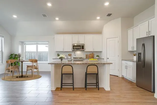 The bright, neutral interior showcases wood-look tile floors, crisp white paint, and dual dining areas for versatile living. The spacious kitchen shines with granite countertops, a large island with seating, stainless steel appliances, gas cooktop, and walk-in pantry—perfect for everyday cooking or entertaining.