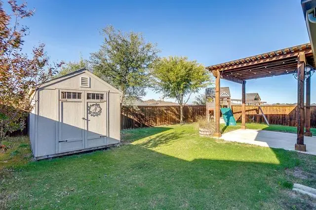 Step outside to enjoy the upgraded backyard oasis complete with a custom-built pergola, extended patio, tool shed, and playscape—all staying for the new owners to enjoy!