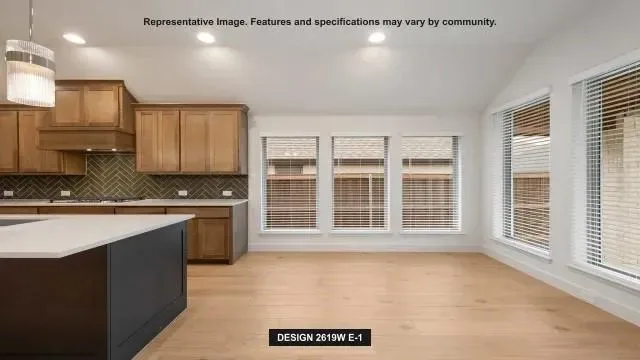 Welcoming front porch opens into an extended entryway adorned with 12-foot ceilings. French doors open into the private home office, located just off the entrance. Down the hallway, you will find the secondary bedrooms, each featuring walk-in closets and a shared full bathroom. Adjacent to the hallway, French doors open into the inviting game room, complete with three large windows. The open family room, featuring a wall of windows and a wood mantel fireplace seamlessly leads into the designated dining area. The corner kitchen boasts an inviting island with built-in seating, a 5-burner gas cooktop, and a walk-in pantry. Entering the primary bedroom, you are greeted with ample natural light from the three large windows. French doors lead into the primary suite, showcasing dual vanities, a freestanding tub, a glass enclosed shower, and two walk-in closets. A guest suite with a walk-in closet and private full bathroom is located off the main hallway. The utility room with an included linen closet is conveniently located adjacent to the game room. Outside includes a covered backyard patio. Completing the home is a two-car garage.