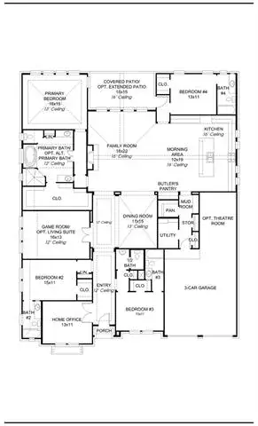 Home office with French doors set at entry. Formal dining room and game room with French doors frame extended entry. Family room with wall of windows and a wood mantel fireplace opens to morning area and kitchen. Kitchen hosts island with built-in seating space, a double wall oven, and 5-burner gas cooktop. Primary suite includes bedroom with wall of windows. Dual vanities, freestanding tub, separate glass-enclosed shower and large walk-in closet in primary bath. All bedrooms feature private baths. Abundant closet space, high ceilings and large windows add to this generous design. Covered backyard patio. Mud room leads to three-car garage.