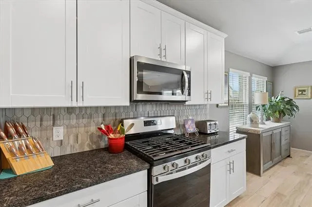 The primary suite includes ample closet space and a luxurious en-suite bathroom. The additional three bedrooms provide versatile space for guests, a home office, or personal use. The tile flooring creates a durable and easy-to-maintain living environment. The stainless steel kitchen appliances lend a modern aesthetic and facilitate efficient meal preparation. The single-level design allows for seamless movement throughout the home.