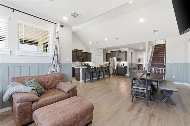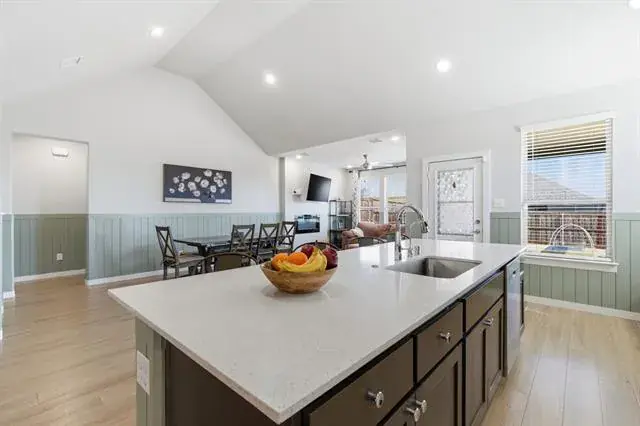 The open-concept main living area showcases abundant natural light, custom wainscoting, and seamless flow into the chef’s kitchen, highlighted by a large center island, extensive cabinetry, and generous prep and gathering space.