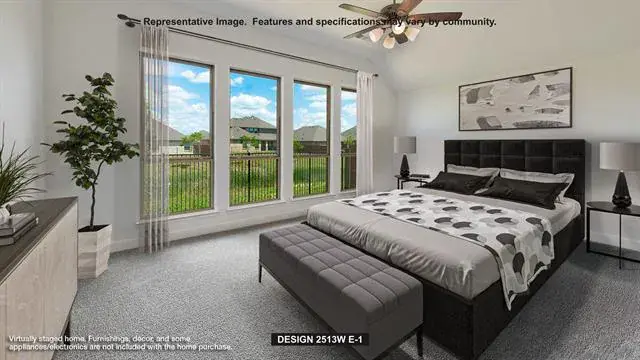 Extended entryway with 12-foot ceilings. Game room with French doors frame the entry. Spacious family room with a wall of windows and a wood mantel fireplace. Open kitchen offers an island with built-in seating space, a 5-burner gas cooktop, and a corner walk-in pantry. Primary suite with a wall of windows. Dual vanities, a freestanding tub, separate glass enclosed shower and two walk-in closets in the primary bath. Guest suite just off the extended entry with a full bathroom and walk-in closet. Secondary bedrooms with walk-in closets. Utility room with private access to the primary bathroom. Covered backyard patio. Mud room just off the two-car garage.