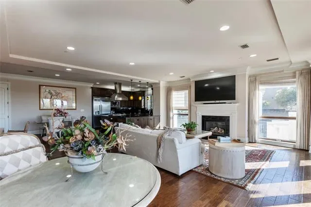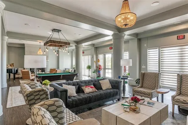 Luxury 2 bedroom, 2 full bath condo located in the exclusive Villa De Leon which sets above the banks of the Trinity River. Condo 110 is an entertainers dream. The kitchen has Viking appliances which includes a six burner gas cooktop, double oven, built in refrigerator and microwave. The expansive open floorplan offers view to wall of windows and sliding glass doors out to patio. This corner condo has direct access from the owner’s patio to the outdoor entertaining area which offers pool, heated spa, pergola, seating and tables, gas grill and pizza oven. This is the perfect area to enjoy the gorgeous sunsets, Trinty River view and nighttime Fort Worth skyline from. The exclusive Villa De Leon has 24 hour concierge security, that is always happy to assist, welcome your guests, receive packages, etc. The spacious primary suite has an ensuite bath featuring a jetted tub, separate shower, dual vanities, and a generous walk-in closet. The secondary bedroom also includes its own walk-in closet, perfect for guests or flexible use and an additional pocket door to close their area for more privacy. Community amenities elevate the lifestyle even further: with a well-appointed community room, offering a piano, pool table, seating areas, and kitchen that may be used for hosting events. The HOA covers gas, water, sewer, and trash costs. Secured parking garage is located in lower level, with two deeded parking spaces and building storage units. Owner’s guests have access to a gated parking lot just across the street. Sundance Square is only minutes away. Luxury, convenience, and comfort come together beautifully in this exceptional Villa de Leon condo. Drapes, washer and dryer are included in listing.