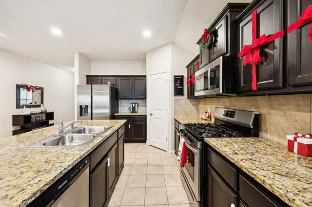 The open-concept living area serves as the heart of the home, ideal for both everyday living and entertaining. The kitchen overlooks the main living and dining spaces and is equipped with granite countertops, a tiled backsplash, Frigidaire appliances, a gas range, and ample cabinetry and prep space. The seamless flow between spaces enhances both comfort and usability.
