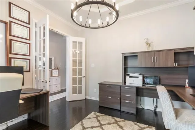 A dedicated office with French doors and bay windows sits off the entry, while a grand central staircase enhances the home’s open, elevated feel.