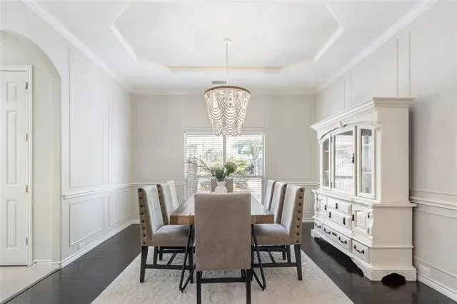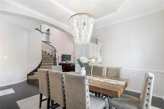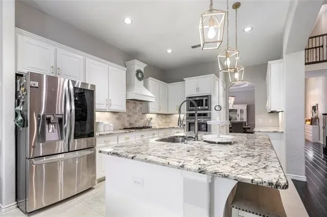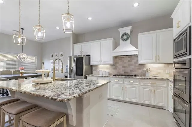 The kitchen is equipped with granite countertops, a large island with breakfast bar seating, gas cooktop, double ovens, and a butler’s pantry, all flowing seamlessly into the dining areas. The spacious primary suite includes a sitting area, backyard access, and an en-suite bath with dual sinks, jetted tub, separate shower, and walk-in closet.