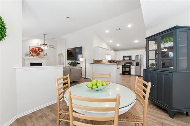 The spacious dining area is filled with natural light and looks into the living room, which features a cozy gas fireplace.