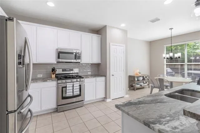 The kitchen showcases new granite countertops, modern backsplash, a large island with breakfast bar seating, a gas range, ample cabinetry, and generous counterspace. Bright white cabinetry and recessed lighting enhance the space, flowing into a cozy breakfast nook with plenty of natural light. A formal dining room provides a bright space for both everyday meals and hosting.