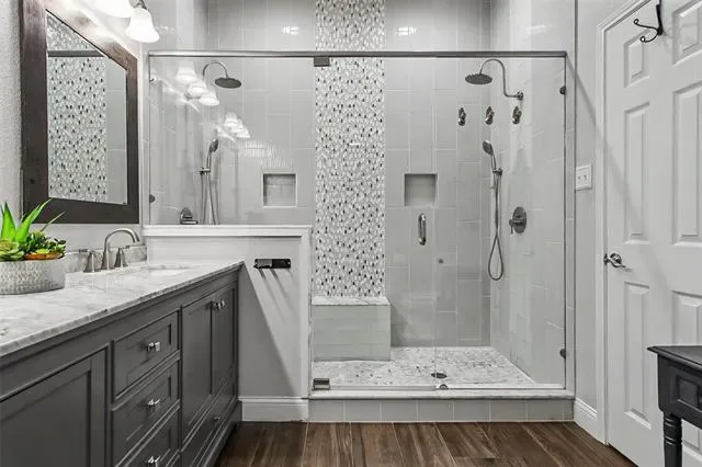 Backyard oasis tucked away in the highly sought-after Villages of Woodland Springs. This beautifully updated 3-bedroom, 2-bath home offers 1,796 square feet of open-concept living with features that truly set it apart. The spacious primary suite includes a stunning ensuite bath with double rain shower heads, gorgeous luxury tile, and a large walk-in closet. Luxury vinyl flooring runs throughout the main living areas, and the bedroom carpet was updated in 2025.