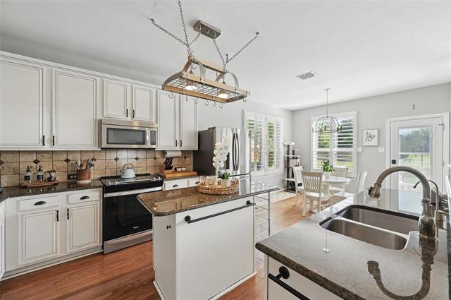 lush, manicured landscaping. Step inside to find a bright and welcoming kitchen featuring a center island, white