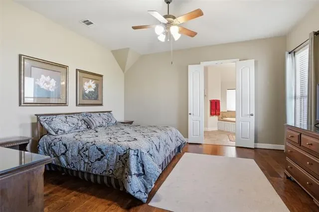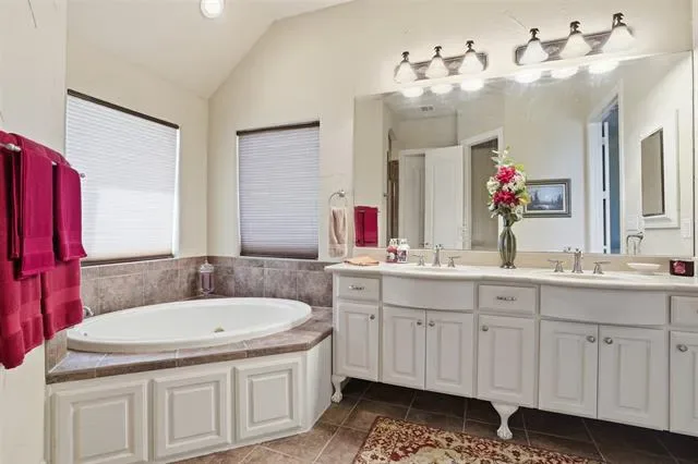 The large primary suite features a jetted tub, separate shower, and an oversized walk-in closet. A split-bedroom layout provides comfort and functionality for families or guests. Both baths have beautiful furniture style vanities with cultured marble tops.