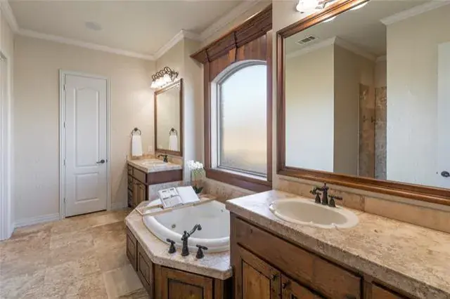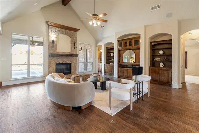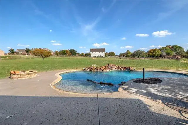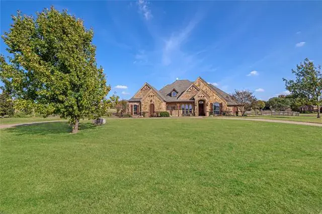 Welcome to this stunning 5-bedroom, 4-bath home set on just over 1.3 beautifully maintained acres, offering luxurious living inside and out. From the moment you step into the grand foyer, you’re greeted with rich natural woodwork, wood-beamed ceilings, and expansive sightlines that lead into the light-filled main living area. The spacious living room features a floor-to-ceiling stone gas fireplace with gas logs, elegant built-in wood cabinetry, decorative lighting, and a cathedral-style ceiling accented by a central wood beam—creating a warm and inviting atmosphere. The living room flows seamlessly into the gourmet eat-in kitchen, showcasing extensive custom woodwork, a 6-burner gas cooktop, butler’s pantry, wine fridge, breakfast nook, breakfast bar, and a generous walk-in pantry. Every detail of this kitchen was designed for both beauty and functionality. Retreat to the luxurious primary suite featuring bay windows, a spa-inspired bathroom with dual sinks and separate vanities, a beautiful garden tub, and a spacious walk-in closet complete with built-in mirror and abundant storage. All secondary bedrooms offer fantastic space, walk-in closets, and ensuite baths—perfect for privacy and comfort. The versatile 5th bedroom doubles perfectly as a home office with elegant French doors, an ensuite bath, and a spacious walk-in closet. The oversized laundry room is equipped with built-in cabinetry, a sink, and a dedicated drip-dry area, giving you all the utility space you could need. Step outside to your personal oasis with huge front and back yards, a sparkling pool with waterfall, and an outdoor grill with bar seating—ideal for entertaining or relaxing under the Texas sky. There is a large decked out attic, perfect for all your storage needs or future build out. This home truly blends luxury, craftsmanship, and exceptional design in every room.