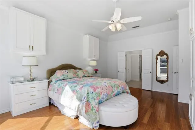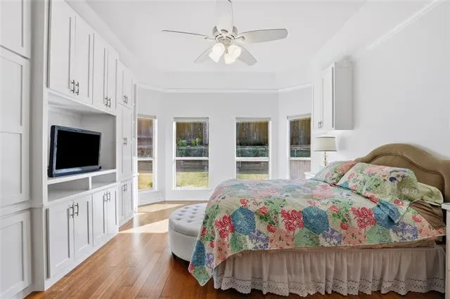 The private primary suite is a true retreat, now enhanced with custom built-ins in both the bedroom and luxurious bath, offering added functionality and refined design. A generous walk-in closet completes the space. Secondary bedrooms are spacious and thoughtfully positioned within a split-bedroom layout for added privacy.