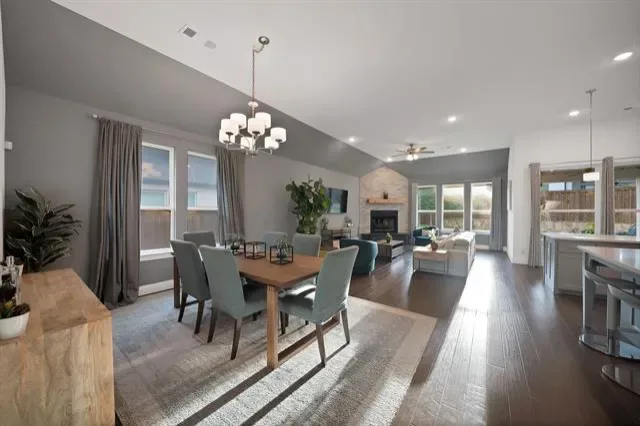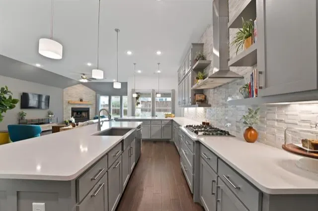 At the center of the home, the kitchen is designed to impress with upgraded double ovens, enhanced appliance package, oversized island, peninsula seating, two pantries, and upgraded tile backsplash extending all the way to the ceiling for a polished designer look. The open-concept living and dining spaces create an easy flow for gatherings large and small.