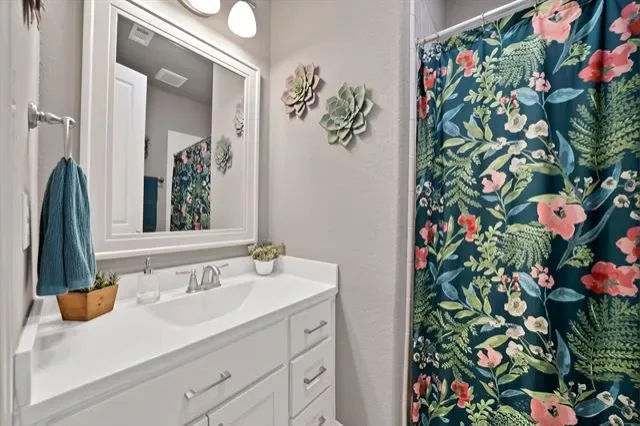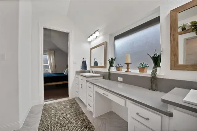 The primary suite includes a customized Elfa closet system from The Container Store, with an additional Elfa system in the front guest bedroom closet. Added shelving in the primary bath and mirrors installed in all bathrooms enhance both storage and function.