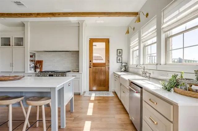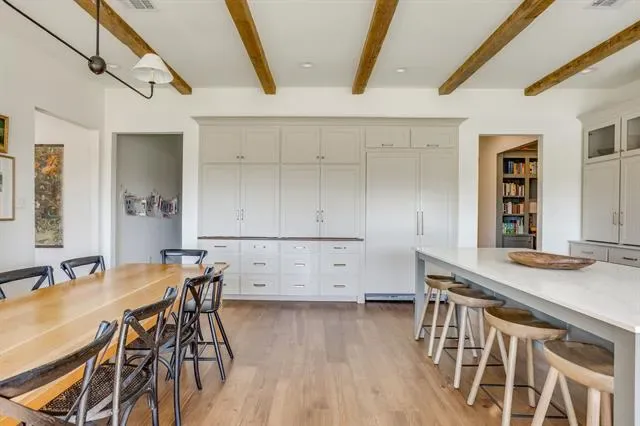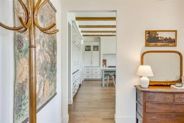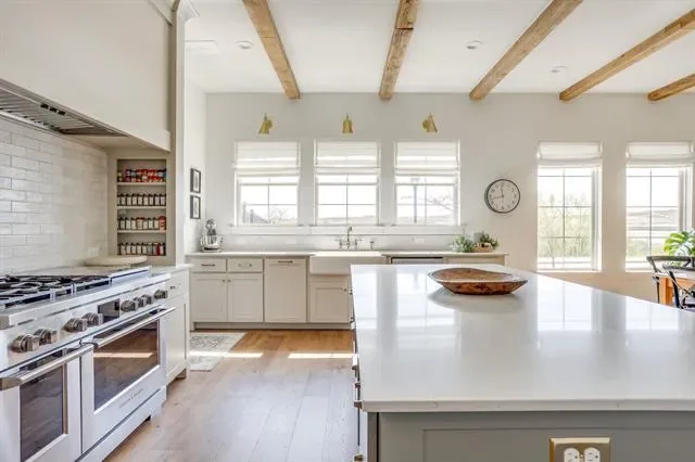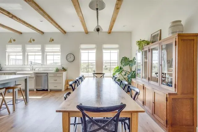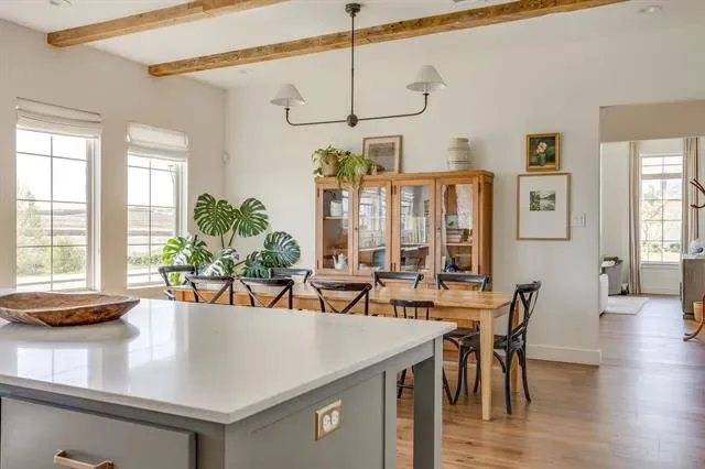 Inside, the main living area is anchored by vaulted ceilings, custom windows, and an easy flow of natural light. The kitchen is thoughtfully laid out with custom ceiling beams, creating a space that feels both functional and well considered. Each room carries a consistent attention to detail without feeling overdone.
