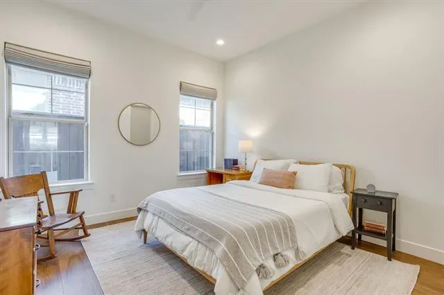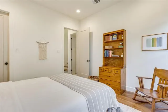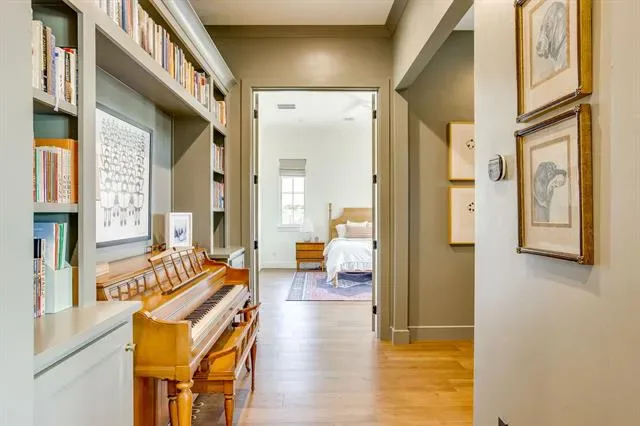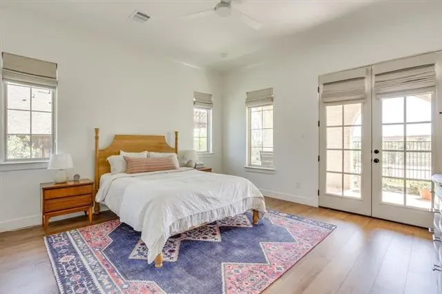 The primary suite is located on the first floor, with double doors that open to a covered porch and easy access to the custom 2024 pool and pergola—creating a natural connection between indoor and outdoor living.