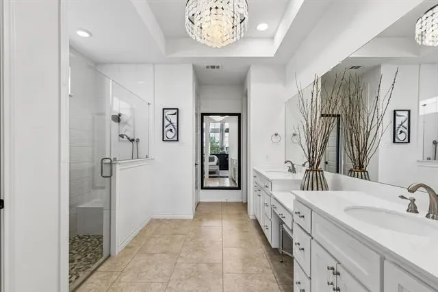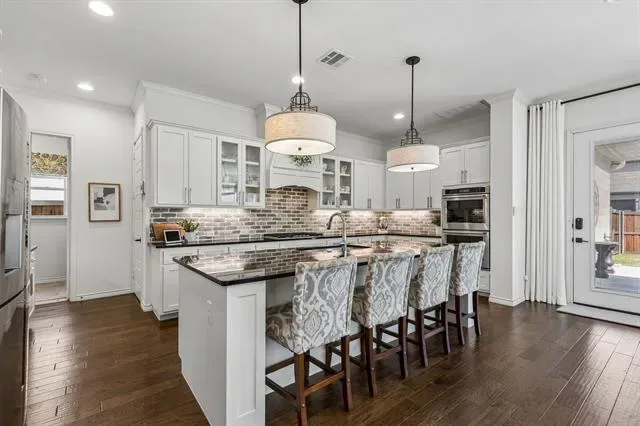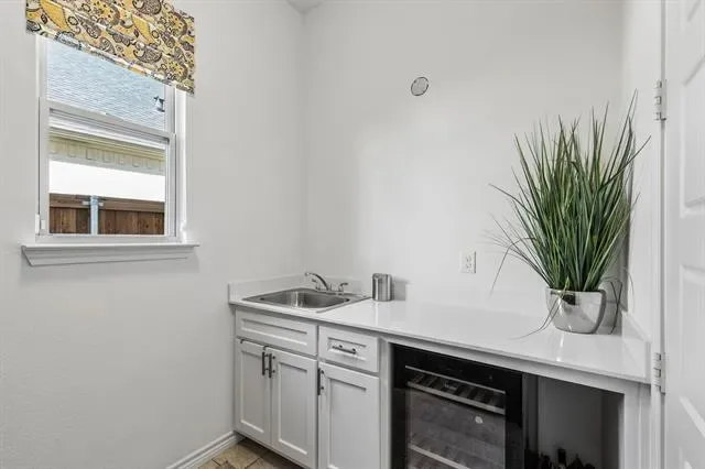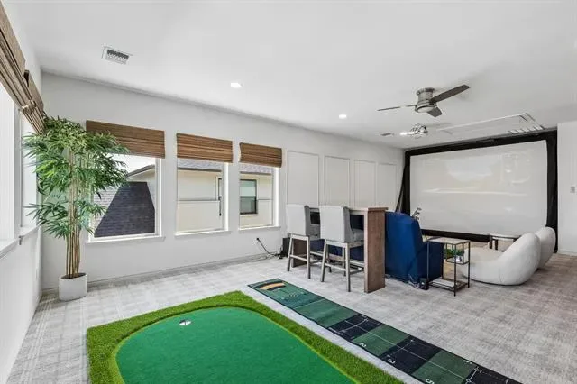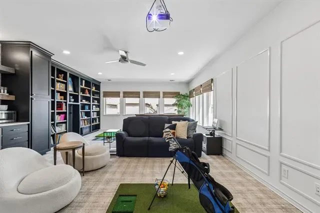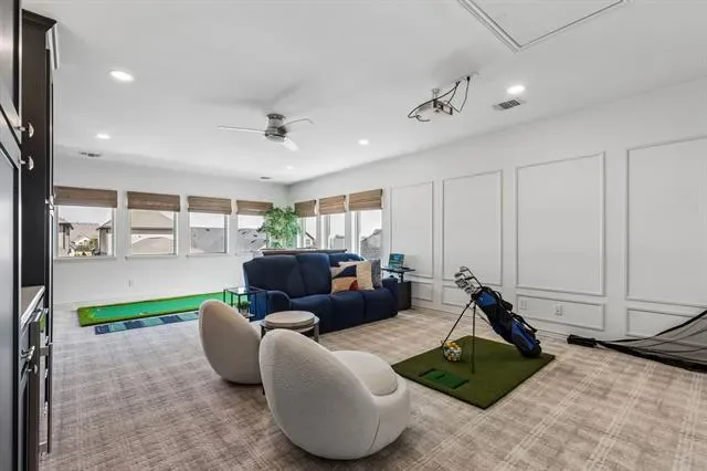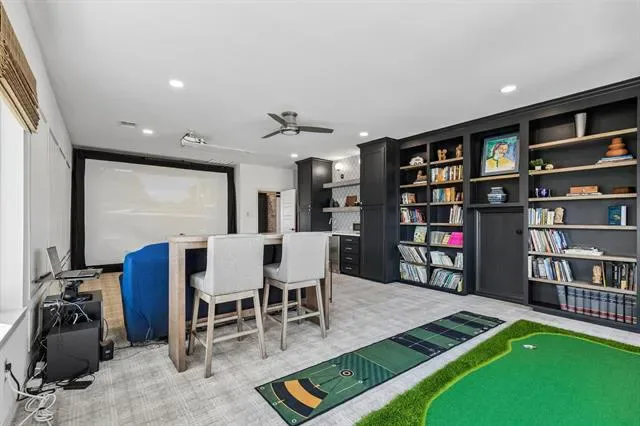 A true standout is the professionally finished Texas basement, transformed into a media and recreation space with a golf simulator, kitchenette with bar sink, custom cabinetry, shelving, and a beverage refrigerator.