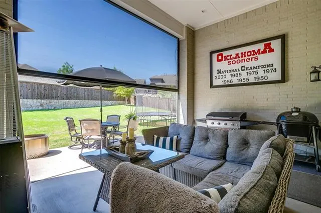 Covered Patio/Porch, Rain Gutters, Lighting, Private Yard