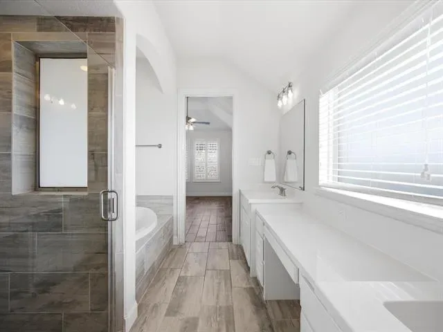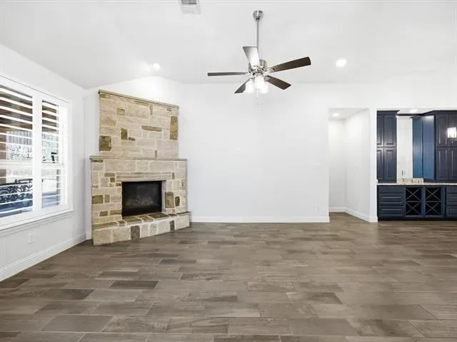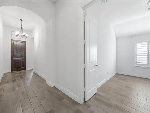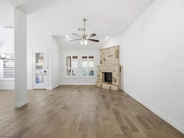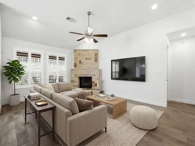 Built by Highland Homes, this one-story 3-bedroom, 2.5-bath home offers an entertainment room, a private office featuring a built-in Murphy bed, and a beautiful living area anchored by a large fireplace. The backyard is designed for both relaxing and entertaining, complete with an outdoor kitchen, covered patio, putting green, and in-ground spa! The open-concept kitchen includes an island, stainless steel appliances, and the electric cooktop is also plumbed for gas. Oversized 2.5 car garage has plenty of storage space. Located within walking distance to Walsh Village, residents enjoy access to two pools, a fitness center with classes, daycare, maker space, and a convenience store with gas station. Founders and Theater Parks, along with playgrounds, are just steps away. Walsh Elementary is approximately a half-mile walk. Community amenities also include hiking and biking trails, a lake with a fishing dock, and a full calendar of resident events. HOA dues cover front lawn maintenance, 2 GBPS internet, and full access to neighborhood amenities.