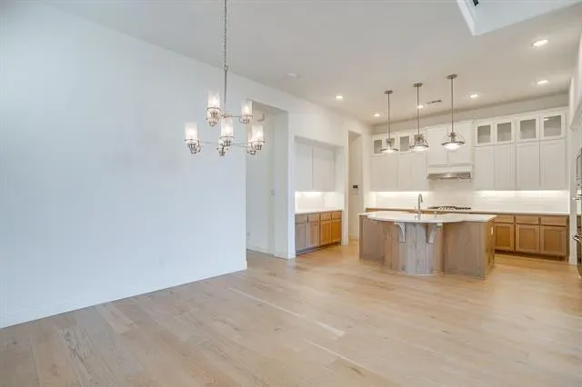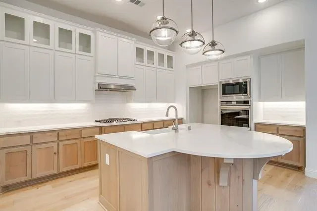 Located on a private lot with no backyard neighbors in Walsh Ranch, this home has it all! When you walk in, you’re greeted by an impressive two-story foyer and a gorgeous, winding staircase. At the front of the house, you’ll find a bedroom with an ensuite bathroom, as well as a beautifully designed office as you approach the kitchen. The kitchen features a stunning table island, quartz countertops, double ovens, and wall-to-ceiling cabinets with undermount lighting. The pantry is huge!