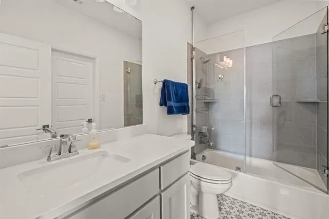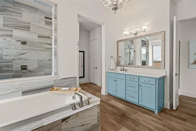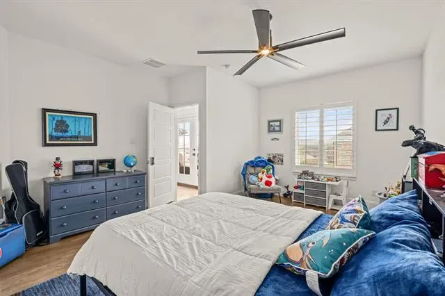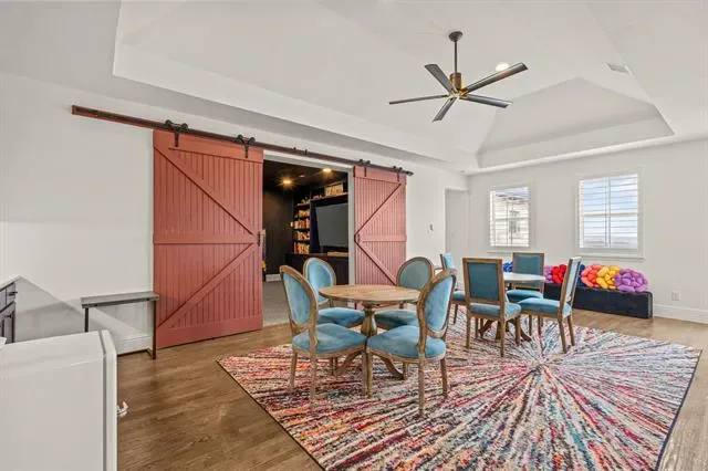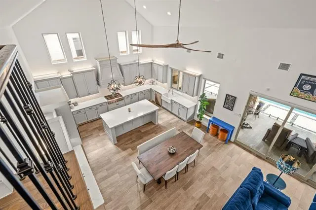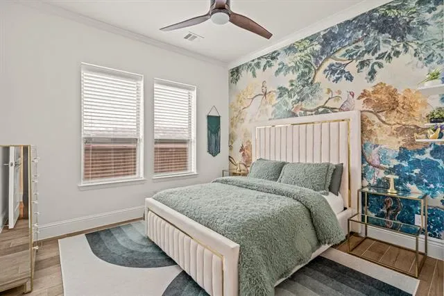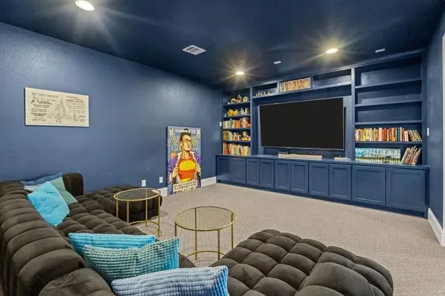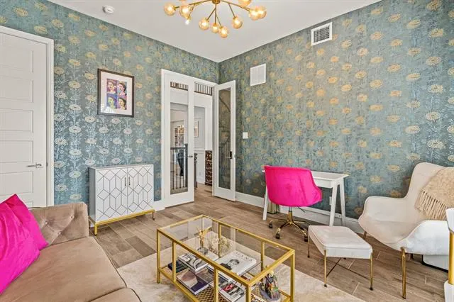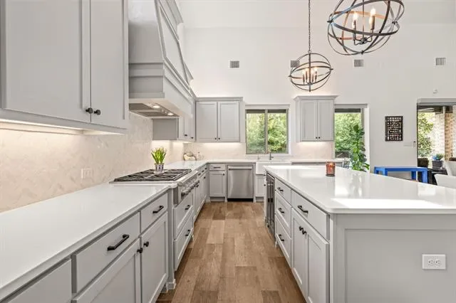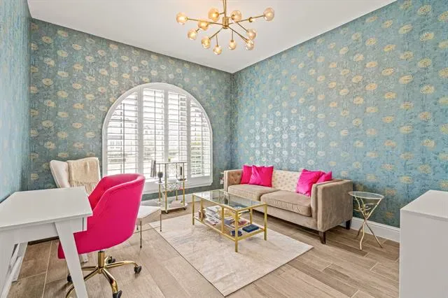 Stunning home in highly sought-after Walsh, featuring designer lighting, custom wallpaper, and a thoughtfully designed layout. Off the foyer, you’ll find a formal dining room to the right and a private office to the left. The open-concept living area features glass sliding doors that seamlessly connect to the private outdoor living space, complete with a fireplace, heated pool and spa, outdoor shower, and mature magnolia trees that create a serene backyard retreat. The home backs to a peaceful greenbelt, providing added privacy. Perfect for entertaining, the eat-in kitchen offers a large center island and high-end appliances and opens to the spacious living room with built-ins and a fireplace. The first-floor owner’s retreat features a spa-like bath and dual walk-in closets, while a guest suite with its own private bath is also located on the main level. Upstairs includes a game room with wet bar, media room, additional sitting area, and two bedrooms with two full bathrooms. Additional features include UV lights in the HVAC system, a whole-home air scrubber, and two humidifiers. Recent updates include a glass fence along the back patio, a new Bosch dishwasher, and floor-to-ceiling bookshelves in the upstairs bedroom and sitting area. Enjoy easy access to Walsh amenities including a fitness center, resort-style pool, sports courts, multiple playgrounds, miles of walking trails, a private lake, dog park, neighborhood market, and fuel station.
