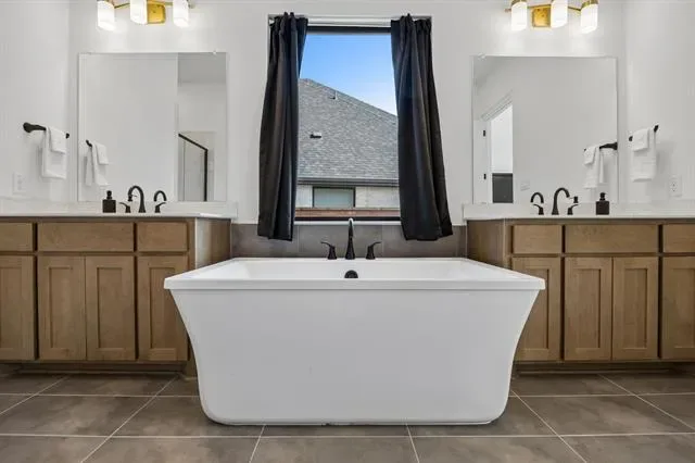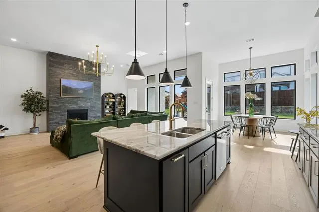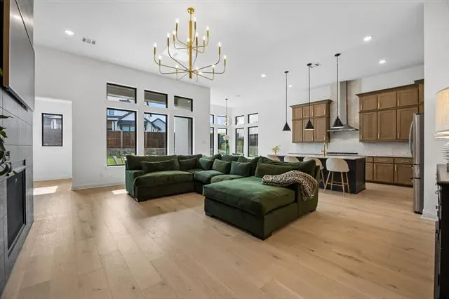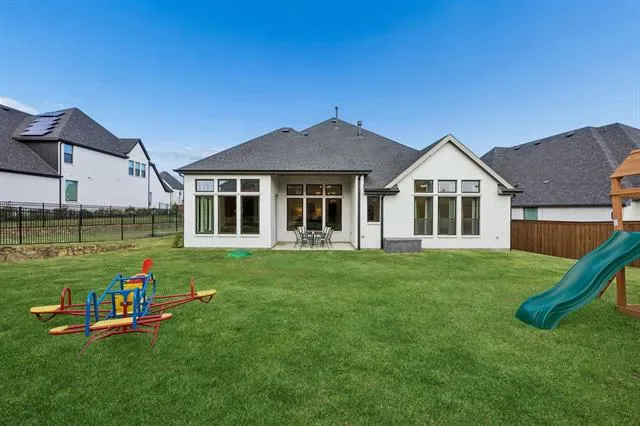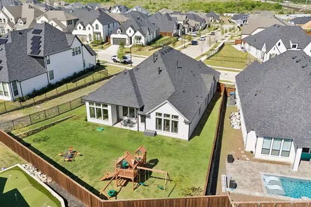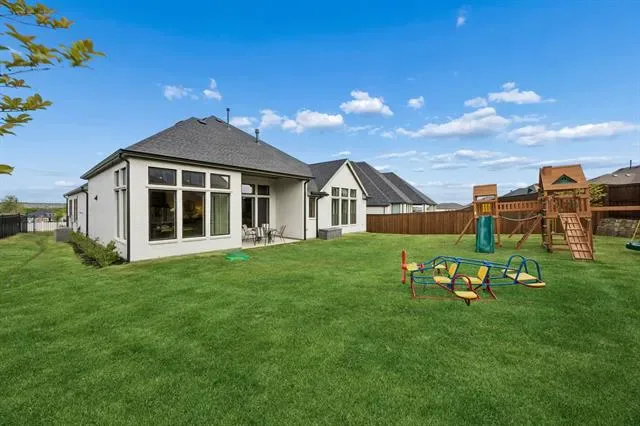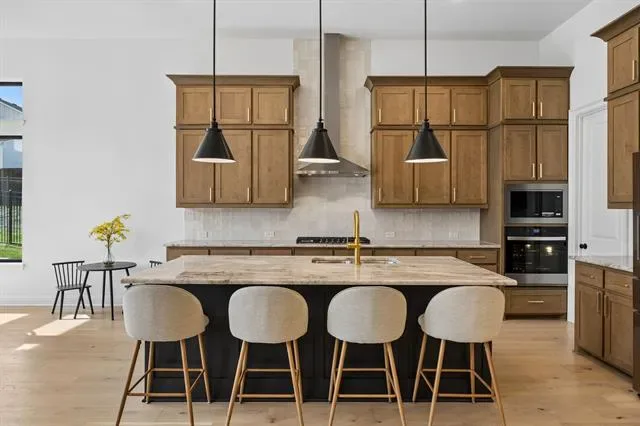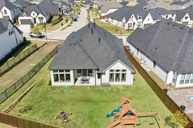 Less than a year old and still under the builder warranty, this Toll Brothers home features the Cisco floor plan on a premium oversized lot, just steps from Walsh’s Overlook Park and adjacent to greenspace, offering added privacy with no immediate neighbor to the right. Zoned to Aledo ISD, this residence showcases a classic style elevation with almost $60,000 in high-end upgrades. Elegant white oak engineered hardwood floors lead you through an open layout that includes four spacious bedrooms (each with a walk-in closet), three full bathrooms, a private home office, and a dedicated media room. The chef-inspired kitchen is equipped with high-level quartz countertops, a gas range, large walk-in pantry, additional custom cabinetry, and upgraded hardware. Architectural interest abounds with soaring cathedral ceilings featured in both the primary suite and the home office. This tech-forward home is fully prepared for modern living with surround sound wiring, custom light fixtures, and dedicated cable and internet ports in every room. The 2.5-car garage adds significant value with an installed EV charging outlet and extra space for your golfcart, storage or a workbench, plus a backyard complete with a brand-new playset and improved drainage. This home is located in Walsh and zoned to Aledo ISD. Residents enjoy access to miles of trails, parks, playgrounds, multiple resort-style pools, a fitness center with weekly classes and drop-in daycare, dog parks, sport courts including pickleball and tennis, planned community events and an on-site elementary school, along with convenient access to Fort Worth, Aledo and Weatherford.