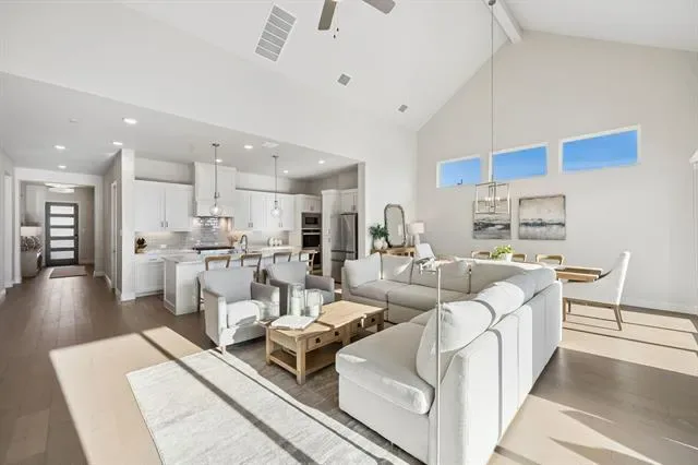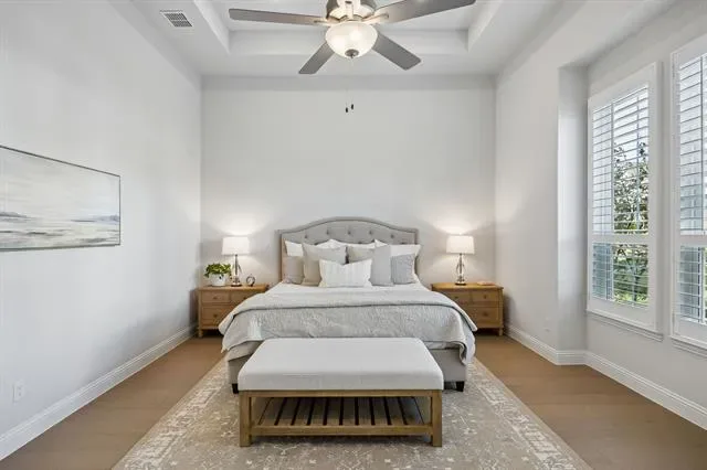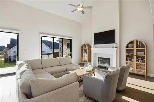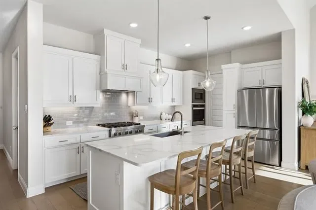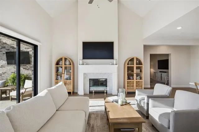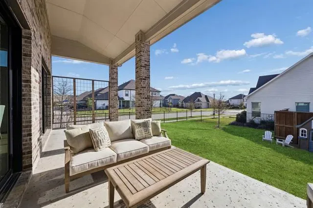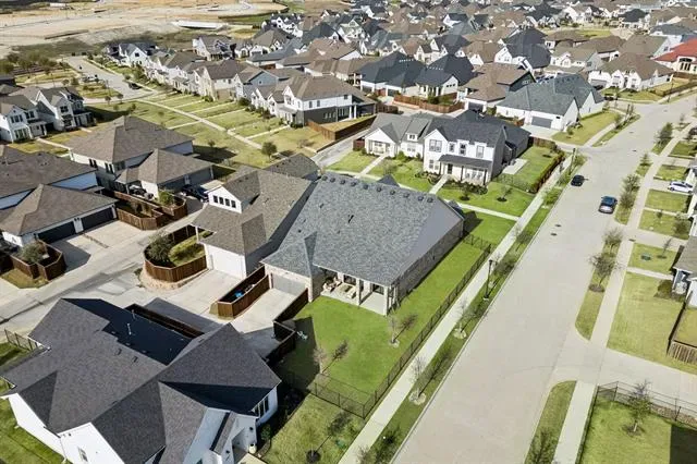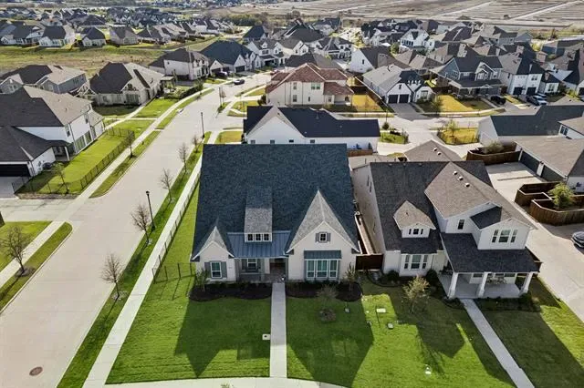 Located in Walsh and zoned to highly regarded Aledo ISD, this Drees home offers a desirable one level floor plan with three bedrooms (two with en-suite baths), three full bathrooms, two living areas, a dining room, separate utility room and a designated office all situated on a large corner lot. This open concept floor plan features a living room with a fireplace and opens to the covered patio through two sets of sliding glass doors creating one continuous indoor outdoor living space. The kitchen includes gas cooking, double ovens, a walk-in pantry, plus an oversized island. The primary suite includes dual vanities, a soaking tub, walk-in shower, a custom closet and a linen closet. The Walsh community offers residents access to miles of trails, parks, playgrounds, multiple resort-style pools, a fitness center with weekly classes and drop-in day care, dog parks, sport courts including pickleball tennis and basketball, planned community events and an on-site elementary school, along with convenient access to Fort Worth, Aledo and Weatherford.