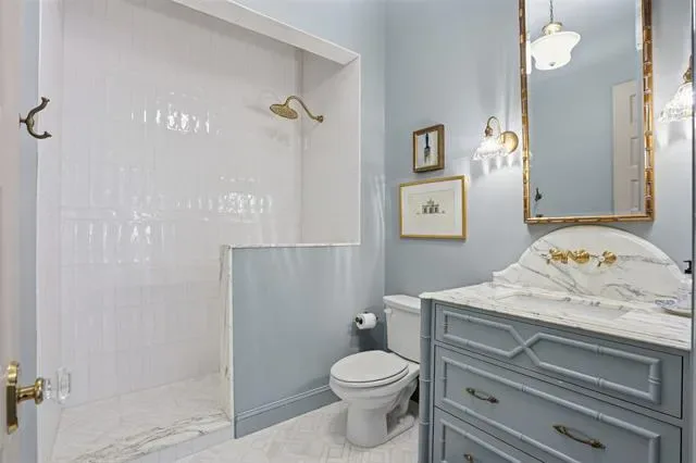 The guest bath has been fully renovated with a marble walk-in shower, custom marble vanity, and brass fixtures. Additional highlights include a custom marble fireplace, wool stair runner with brass hardware, and built-in storage in the mudroom and garage.