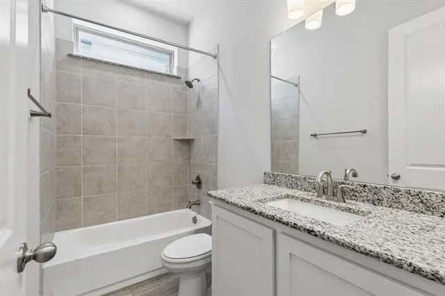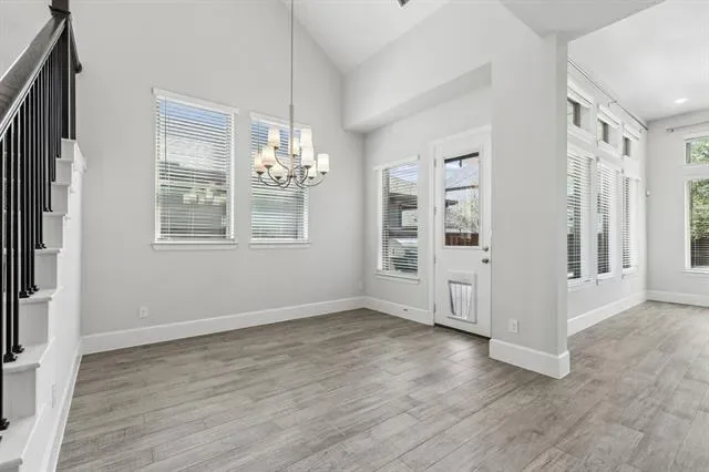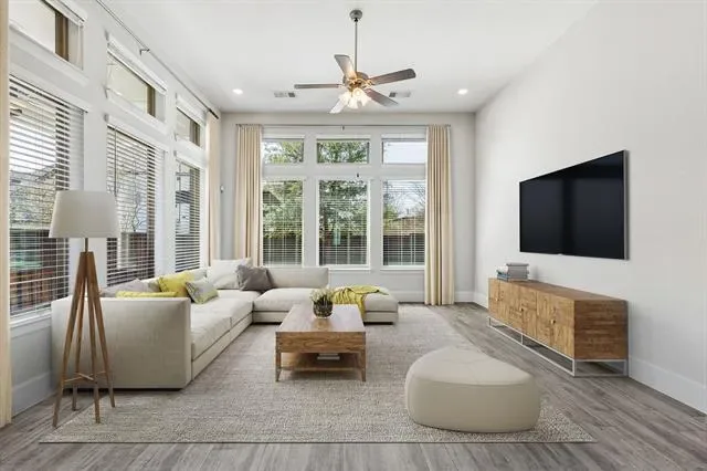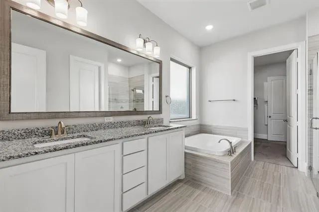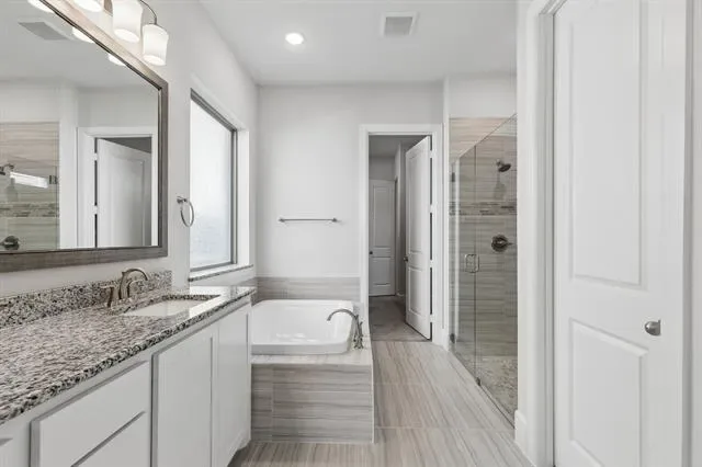 The interior features wood-look tile flooring for easy maintenance, neutral tones, and abundant natural light throughout. The primary suite includes a spa like bathroom with soaking tub, oversized walk-in shower, and plenty of space for everyday life and relaxation.
