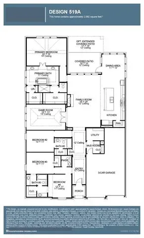 Entry welcomes with 12-foot ceiling. Open family room features wall of windows and a fireplace. Kitchen hosts generous island with built-in seating space and a wine cabinet. Adjoining dining area features two walls of windows. Game room with French doors just off family room. Primary suite includes bedroom with 14-foot ceiling. Double doors lead to primary bath with dual vanities, a freestanding tub, separate glass-enclosed shower and two large walk-in closets. A guest suite and Hollywood bath add to this spacious four-bedroom home. Extended covered backyard patio. Mud room off three-car garage.