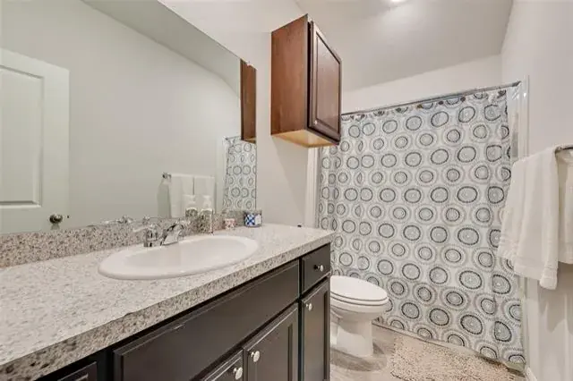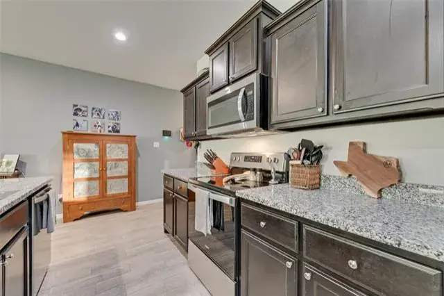 The spacious living and dining areas flow seamlessly into the kitchen, which opens beautifully to the main living space and is equipped with granite countertops, stainless steel appliances, a large center island, and a corner walk-in pantry—perfect for everyday living and entertaining. The private primary suite features an en-suite bath and a generous walk-in closet, while secondary bedrooms offer flexibility for guests, family, or a home office.