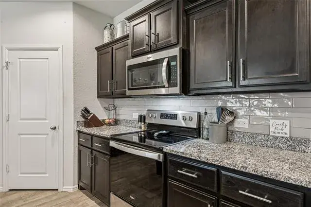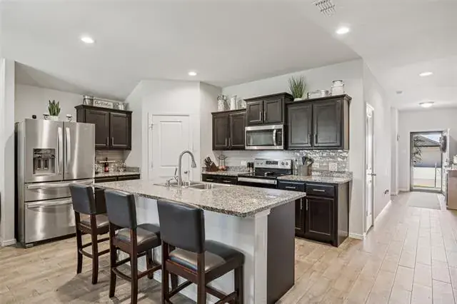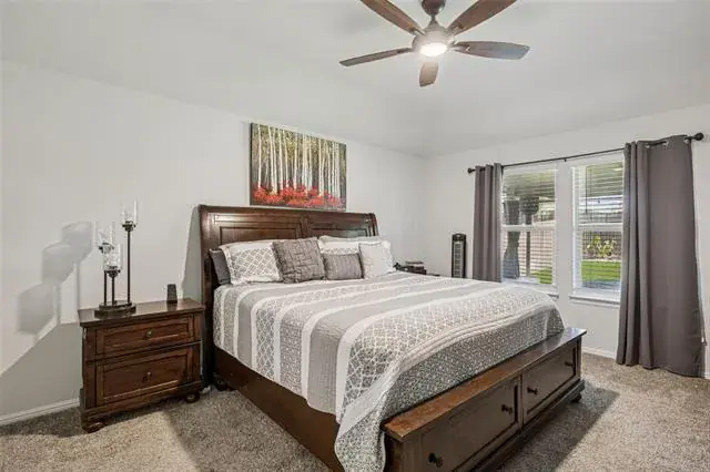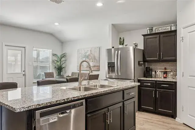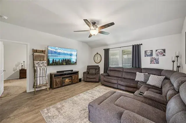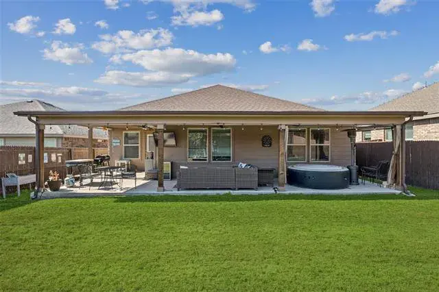Discover this inviting 4-bedroom, 2-bath home in the desirable Watersbend community, zoned to the highly acclaimed Eagle Mountain ISD. From the moment you arrive, you’ll appreciate the home’s strong curb appeal, highlighted by raised flowerbeds and well-kept landscaping that create a warm first impression. Inside, the thoughtfully designed layout offers both comfort and privacy. Secondary bedrooms are positioned at the front of the home, while the private primary suite is tucked away at the back. The primary ensuite features dual sinks and a spacious walk-in closet, creating a relaxing retreat at the end of the day. At the heart of the home, the open-concept living, dining, and kitchen areas come together seamlessly—perfect for everyday living and effortless entertaining. Step outside to enjoy an extended, fully covered patio, ideal for grilling, relaxing, or hosting gatherings. The generously sized backyard offers room to roam, garden, or create your own outdoor oasis. Enjoy the convenience of being just minutes from Alliance Town Center, Presidio Junction, I-35W, and Hwy 287, providing quick access to shopping, dining, and commuting routes. Residents also enjoy access to Watersbend’s resort-style amenity center, featuring two pools with water slides, a splash zone, playground, and more across 4.5 acres of fun. This well-cared-for home blends comfort, convenience, and community—schedule your showing today and see why Watersbend is such a sought-after place to call home!