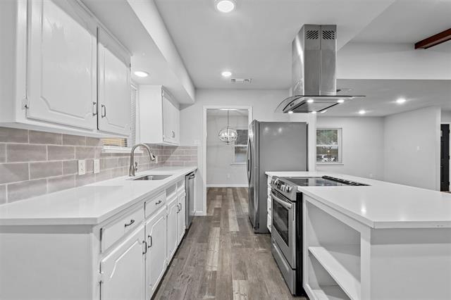 • Heart of the Home: The kitchen boasts sleek quartz countertops, undermounted sinks, and stainless steel appliances, highlighted by a bold stove vent over the central island.