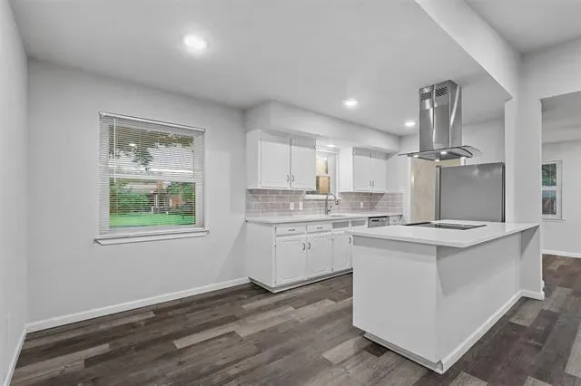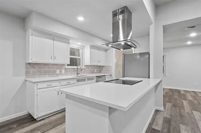 • Heart of the Home: The kitchen boasts sleek quartz countertops, undermounted sinks, and stainless steel appliances, highlighted by a bold stove vent over the central island.