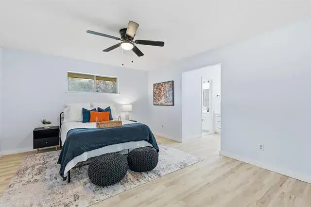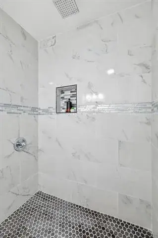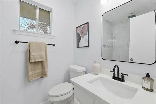 The private primary suite offers a calm retreat with direct access to an updated bath featuring a walk in shower, modern tilework, black fixtures, and a dedicated vanity area. Additional bathrooms continue the clean aesthetic with quartz counters, updated lighting, and thoughtful finishes.