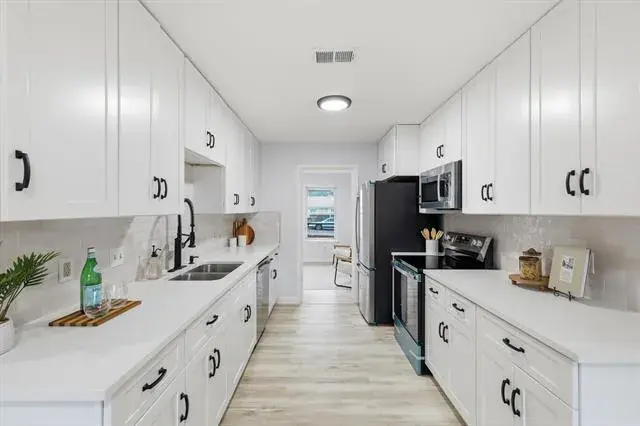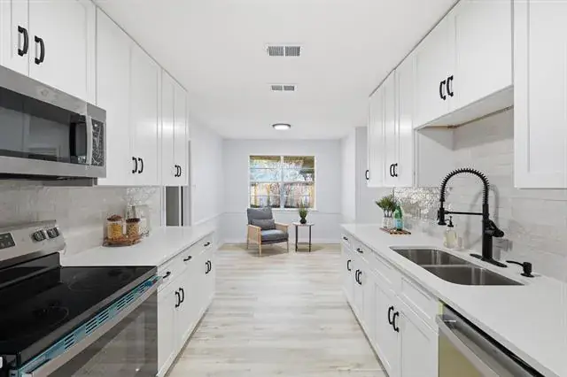 The kitchen is a true standout with crisp white cabinetry, quartz countertops, subway tile backsplash, matte black hardware and fixtures, and all new stainless steel appliances. A galley layout maximizes storage and prep space while keeping everything functional and streamlined.