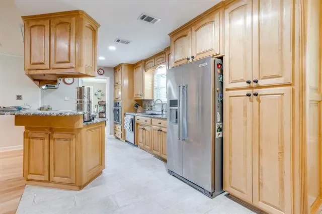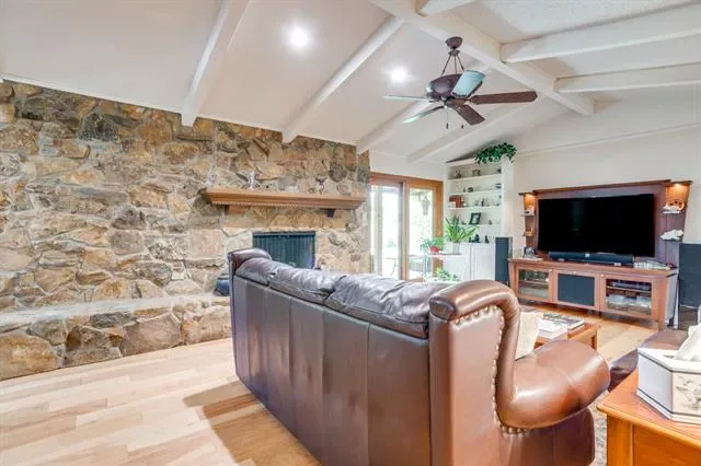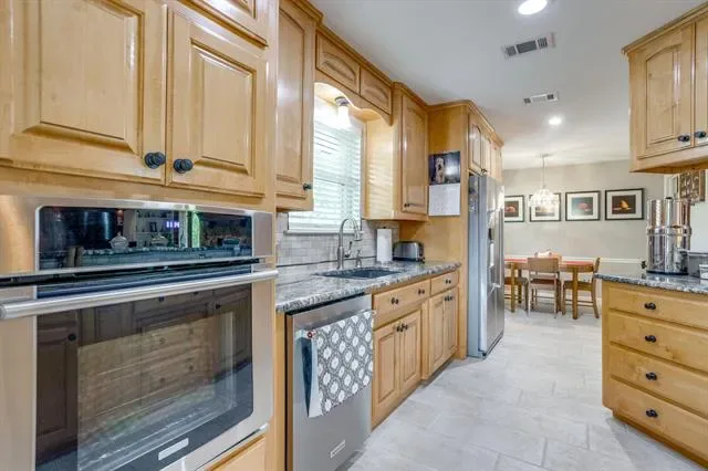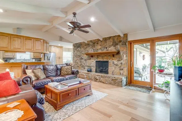 Charming 3-bedroom, 2 and half-bath home situated on an oversized corner lot with beautiful curb appeal and thoughtful upgrades throughout. This spacious home offers an open floorplan complemented by rich Hickory hardwood flooring in the main living areas, creating a warm and inviting atmosphere. The kitchen is a standout feature, boasting granite countertops, custom maple cabinetry, stainless steel appliances, and a premium Electrolux induction stovetop and convection oven—perfect for both everyday living and entertaining. The home also includes both a formal living room and formal dining room, providing flexible spaces for gatherings or a home office. The main living area is anchored by a cozy stone fireplace with gas logs, ideal for relaxing evenings. Additional interior highlights include upgraded energy-efficient Ultrex windows, wood blinds throughout, and new interior doors. Step outside to enjoy large covered patios at both the front and back of the home, surrounded by mature landscaping and supported by a full sprinkler system. The backyard also features a 14×12 custom-built workshop with electricity, new windows, and built-in cabinetry with countertops—perfect for hobbies, storage, or workspace needs. Additional features include a security system and numerous upgrades that enhance both comfort and efficiency.