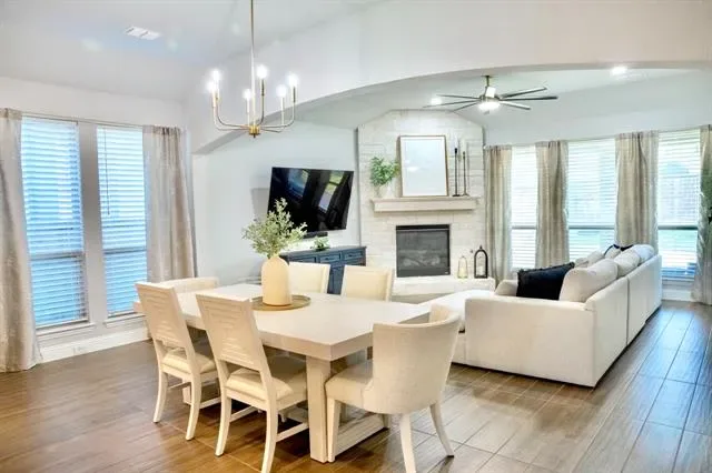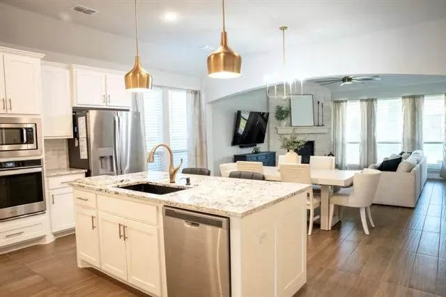 BEAUTIFULLY upgraded home in highly sought-after Northwest ISD, nestled in the stunning Wellington community. Unlike other builder grade homes, this home has been thoughtfully transformed with stylish custom features that elevate both design and function. This spacious 3-bedroom, 2.5-bath, 3-car garage home offers an inviting open-concept layout perfect for modern living including an OFFICE and FLEX room! Recent CUSTOM UPGRADES include elegant new lighting, rich granite countertops, and updated plumbing fixtures throughout. The main living area showcases a new beautiful stone fireplace, designer backsplash, and a custom-built vent hood that adds character and charm. The new iron front door and exterior lighting also make a striking first impression. The primary suite is a relaxing retreat featuring a generous walk-in closet, soaking tub, separate shower, dual vanities, and updated mirrors for a polished, contemporary feel. Enjoy your morning coffee in the fenced backyard or go for a swim in the community pool! The neighborhood has parks, playgrounds, walking and biking trails for all to enjoy! Excellent location, close to I35 with a short commute to Ft. Worth and Alliance. Don’t miss out on this gorgeous MOVE-IN READY home!
