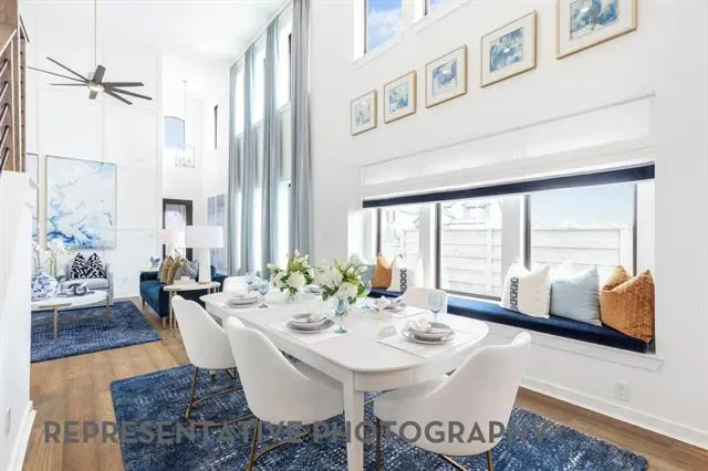 This charming two-story floor plan is designed for both comfort and functionality. The main floor features an open-concept kitchen with a central island, seamlessly connecting to the dining area and living room, which leads to a cozy patio for outdoor enjoyment. The primary suite offers a luxurious retreat with an ensuite bathroom. A secondary bedroom with a full bathroom rounds out the 1st floor. The rear-entry two-car garage offers ample storage and parking. Upstairs, you’ll find a versatile loft area, perfect for additional living space or a playroom, along with bedrooms three & four, which share access to a full bathroom. The open-to-below design enhances the sense of space and connection throughout the home.