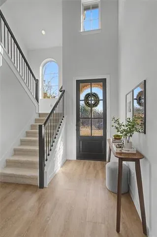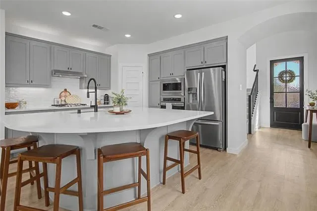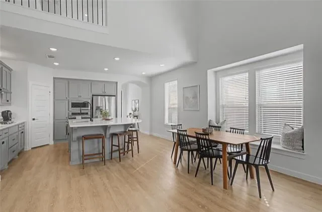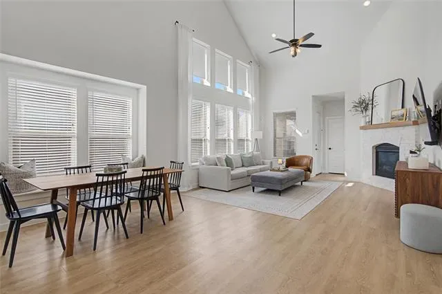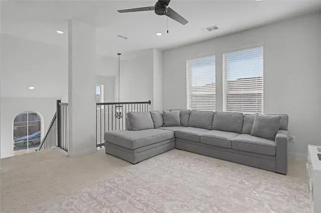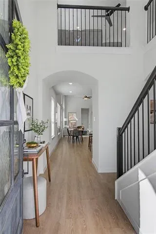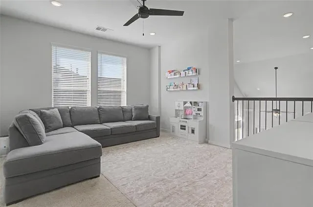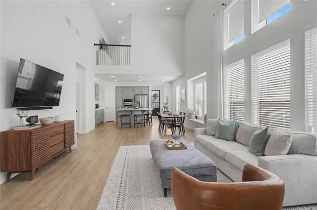 Looks and shows like a model. Everything in this beautiful home was upgraded when it was built or shortly after. Special features like an outlet in the custom pantry that includes a space for the trash can, motorized shades on the high windows in the living room, custom storage in the primary bath which also has an AC outlet. 20 foot ceilings in the living room. An inviting kitchen that opens to dining and living with a large island bar that is perfect for entertaining. There is even a split AC unit in the garage for the hot summer days if you want to use that for an exercise space. Private office adds to this great floorplan. The primary bathroom has a large separate shower, two sinks with upgraded fixtures and amazing storage. The back patio features custom shades on the west side and a turfed extension of the back patio.