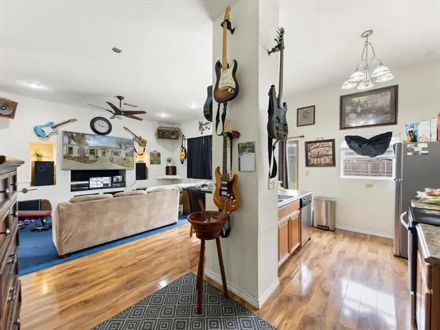 Beautiful treed lot and peaceful setting in the desirable West Oakhurst subdivision! This charming home offers living space on a spacious interior lot with mature trees and a private backyard retreat. The home blends classic character with flexible living spaces and modern conveniences. The backyard is designed for privacy and functionality, featuring a fenced yard with electric gate access, RV parking, multiple storage buildings, patio areas, and a concrete walkway. A 20×9 storage building with electricity provides excellent space for hobbies, tools, or workshop use. Plentiful parking includes a 2 car attached garage, carport, and dedicated RV storage. Inside, wood floors highlight the large living area and oversized formal dining room, creating a warm and inviting space for entertaining. The kitchen offers a breakfast nook, pantry, quartz countertops, gas cooking, stainless steel appliances, and extra utility hookups for added convenience. A flexible study or bonus room sits just off the living area with an exterior door leading to the backyard. This space is ideal for a home office, music room, nursery, or creative studio. A pocket door connects the study and the spacious primary suite, which features two closets and plenty of natural light. One of the most unique features of the home is the separate yet attached quarters complete with a full kitchen, bathroom, utility room, and private entrance perfect for multigenerational living, guest accommodations, rental potential, or a private workspace. The second bedroom, which currently adjoins the quarters, is generously sized and includes a walk-in closet. Located in the historic Oakhurst area known for its mature trees, established homes, and close proximity to downtown Fort Worth, this property offers charm, versatility, and exceptional outdoor space. A rare opportunity to enjoy privacy, character, and flexible living in one of Fort Worth’s most established neighborhoods.