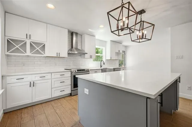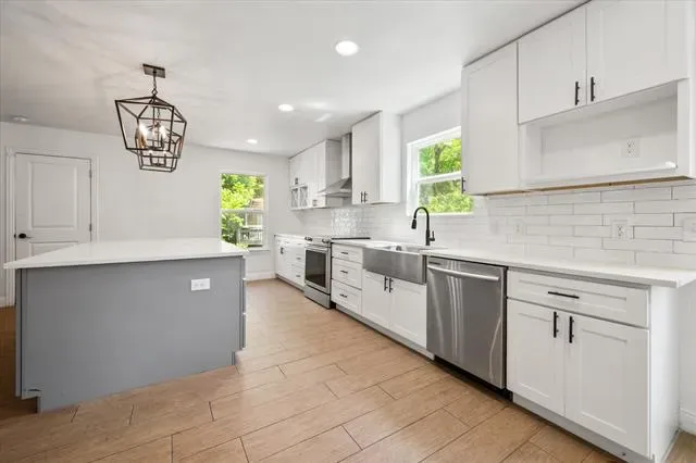 Step inside to a bright, open-concept layout featuring expansive living and dining spaces, perfect for entertaining or everyday living. The show-stopping kitchen is the heart of the home, complete with a massive quartz island, farmhouse sink, stainless steel appliances, custom cabinetry, and designer lighting that adds warmth and sophistication.