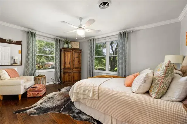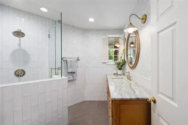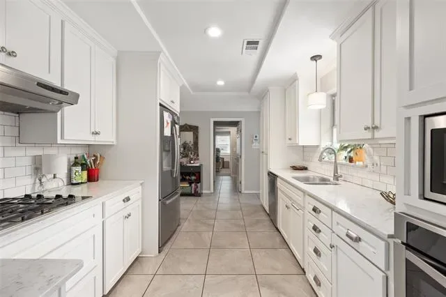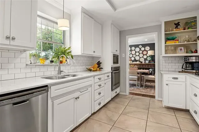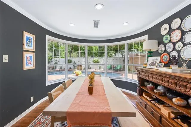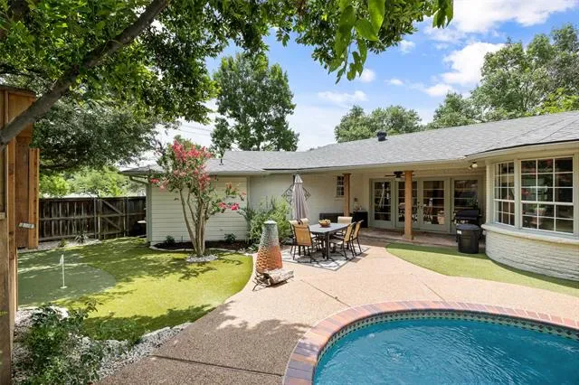 Step into an exquisite blend of classic charm and contemporary sophistication. This thoughtfully reimagined home boasts a stunning remodel that enhances both form and function. The meticulously reconfigured floor plan exudes an effortless flow, anchored by a generous galley-style kitchen with an inviting openness perfect for modern living and entertaining. Naturally lit living and dining areas seamlessly merge indoor elegance with outdoor splendor, offering captivating views of the backyard oasis. The formal living room extends gracefully to a covered stone patio, an idyllic space for gatherings or quiet moments of retreat. Rich hardwood floors grace the main living areas and two bedrooms, including a serene primary suite. Across the home, two additional bedrooms share a well-appointed bath, creating a harmonious separation of private and shared spaces. The backyard is nothing short of a sanctuary, featuring a sparkling pool framed by lush landscaping—a true haven for relaxation and entertainment. No Survey, Buyer will need to purchase new survey.