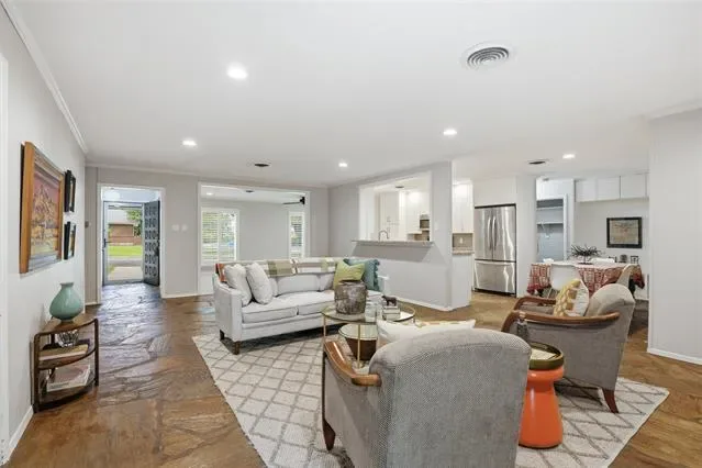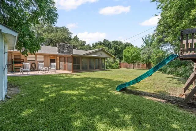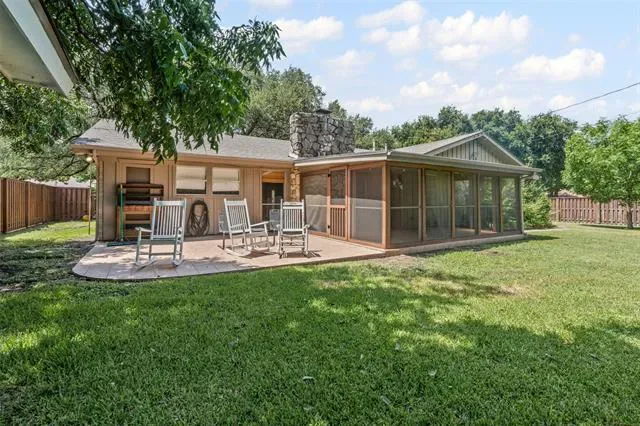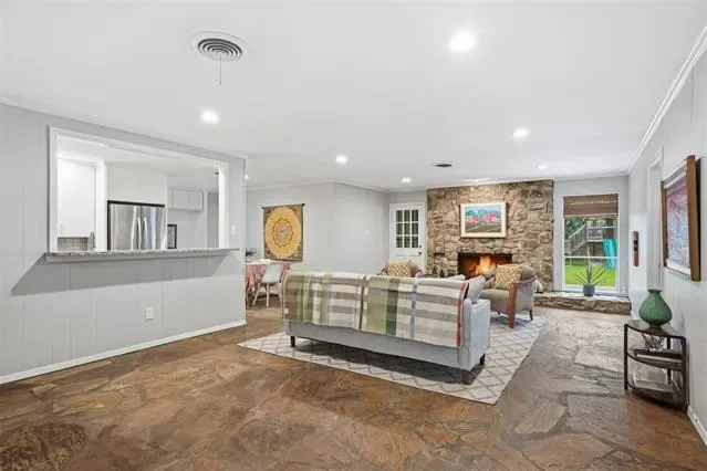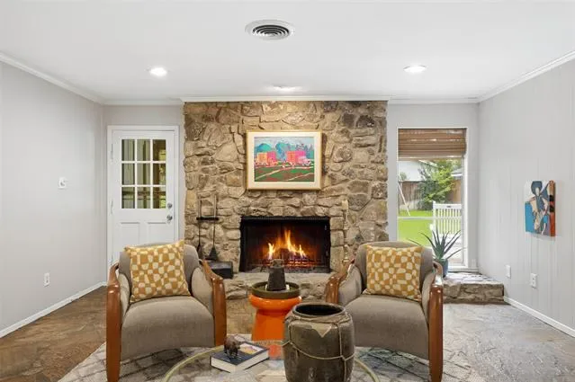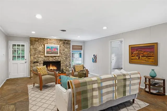 Welcome home to this charming ranch-style residence in the highly sought-after Overton Park school zone! Beautifully sited on a corner lot shaded by mature live oak trees, this updated home offers flexible living and dining spaces to fit your lifestyle. The open kitchen features granite countertops, stainless steel appliances, and plenty of storage. A spacious family room centers around a stunning floor-to-ceiling stone fireplace, creating a cozy and inviting focal point. The primary suite offers privacy with a dedicated study, while two secondary bedrooms share a well-appointed bath on the opposite side of the home. Additional features include a convenient mud bench by the laundry room, a screened-in porch ideal for year-round enjoyment, and a large backyard perfect for play or entertaining. New HVAC July 2023, new electrical panel with 220 service to garage June 2022.